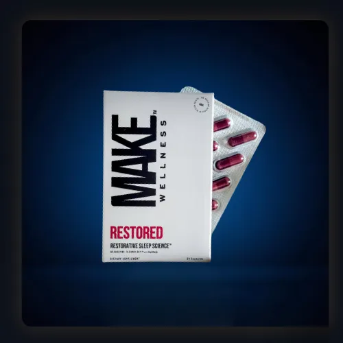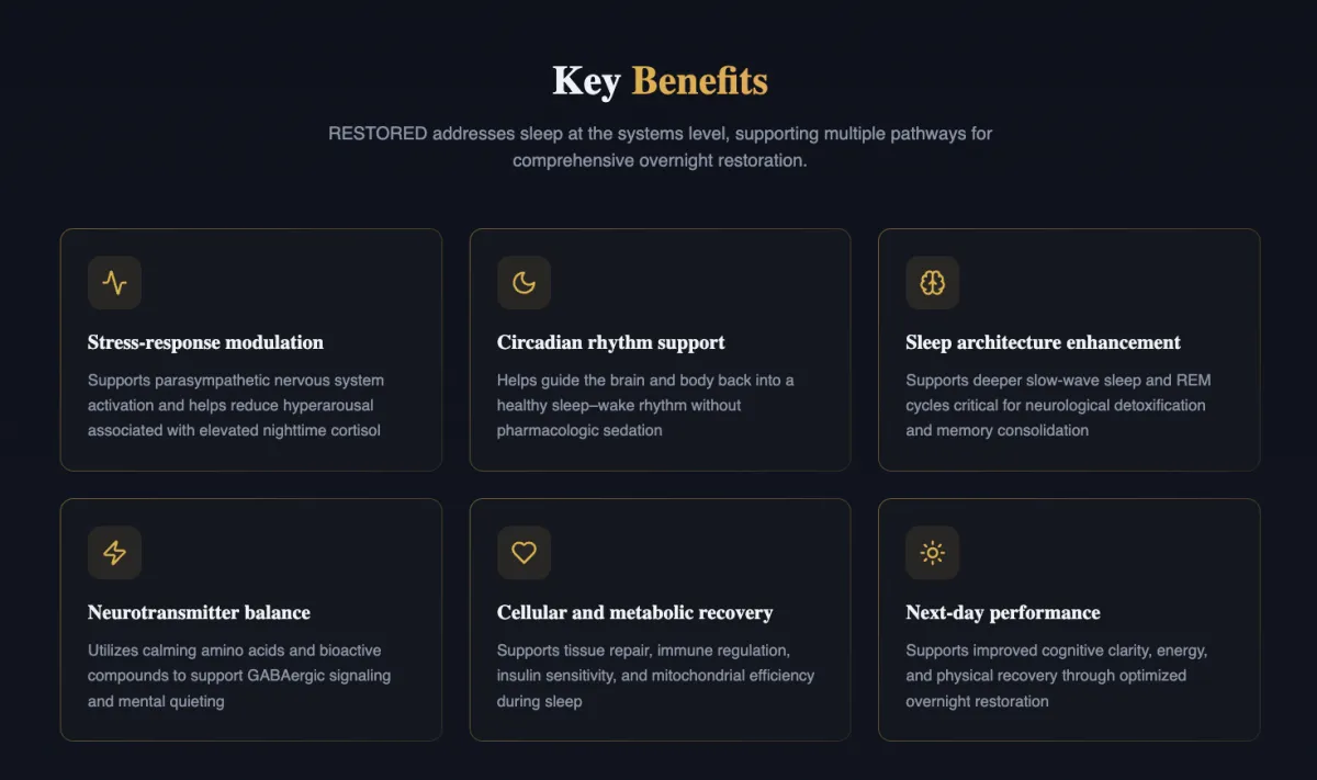 RESTORED™ is a clinically aligned sleep-support formula developed to address sleep disruption at the systems level. Rather than inducing sedation, RESTORED supports the body's natural sleep architecture by modulating stress response, supporting circadian rhythm balance, and promoting the physiological conditions required for deep, restorative sleep.